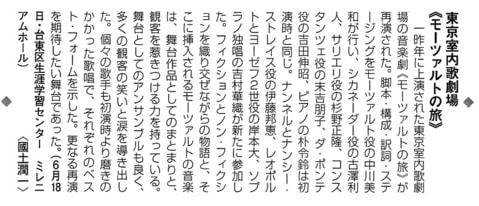 先月上演された、音楽劇「モーツァルトの旅」(再演)のコンサート評が『音楽の友』8月号に掲載されました。