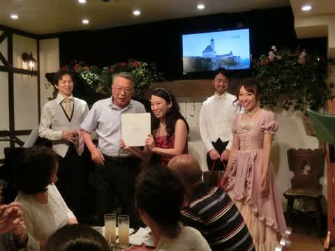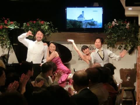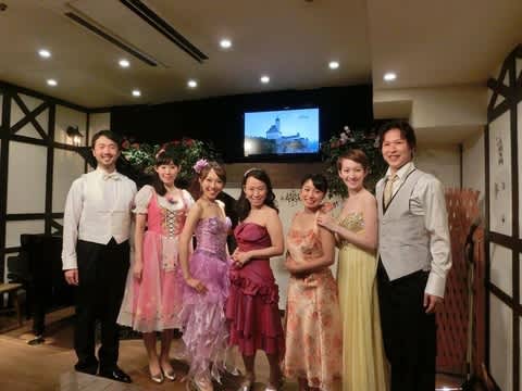 左からバリトン李昇哲さん、ピアノ柵山理恵さん、ソプラノ佐藤智恵さん、私、MC遠山美樹さん、バイオリン田口薫さん、テノール斎木智弥さん