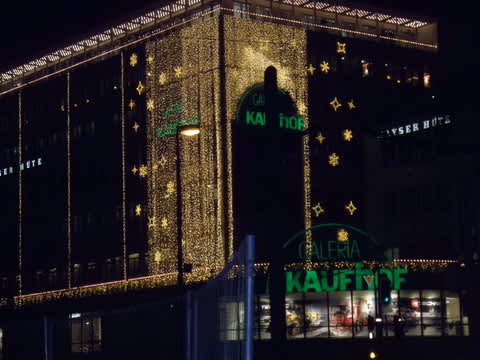 下の写真はクリスマスマルクトではありませんが、ミュンヘンの中心街、カールスプラッツのイルミネーション。もうクリスマス全開。