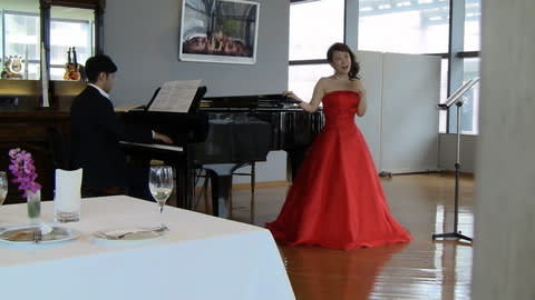 ピアニストの田中健さんに、ヴェルディ『椿姫』乾杯の歌を弾いて頂きながらね