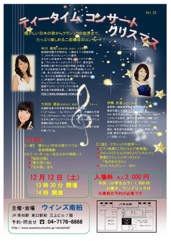 12月12日に「ティータイムコンサート・クリスマス」という。ウィンズ南柏さんという貸しスタジオさん主催のコンサートに出演させて頂きます。