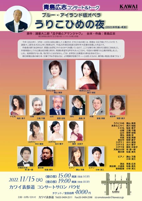 林光先生の「あまんじゃくとうりこひめ」は和物オペラの名作ですし、青島先生の「うりこひめの夜」は今回が初演です。