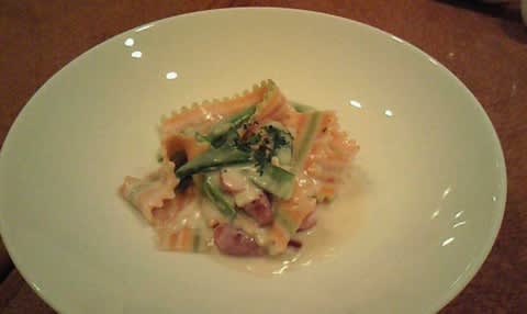 リングイネ、でしたか。七色の平麺巨大パスタてした。おいしかったー。甘めな感じで。でもデザートがあったから全部は食べられなかったの